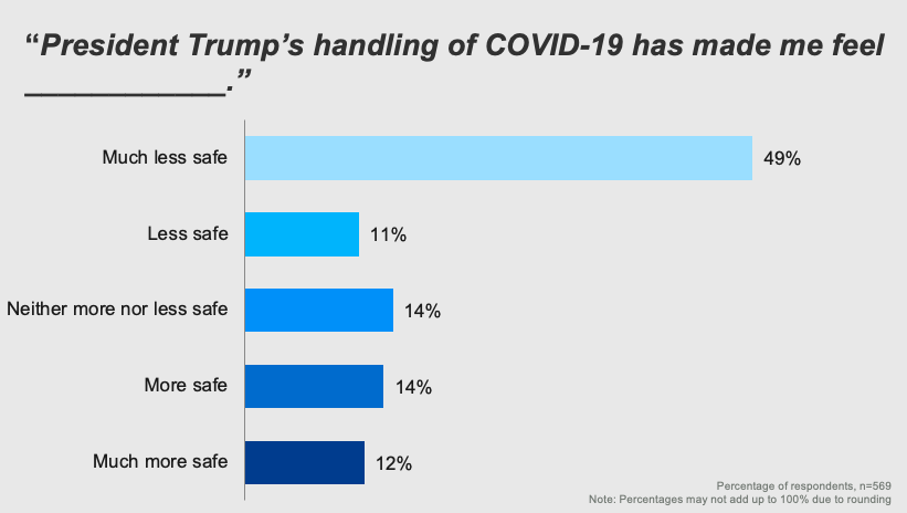 When asked about President Trump’s handling of the pandemic, 49% responded that it made them feel much less safe. At the same time, 26% said his response made them feel safer.