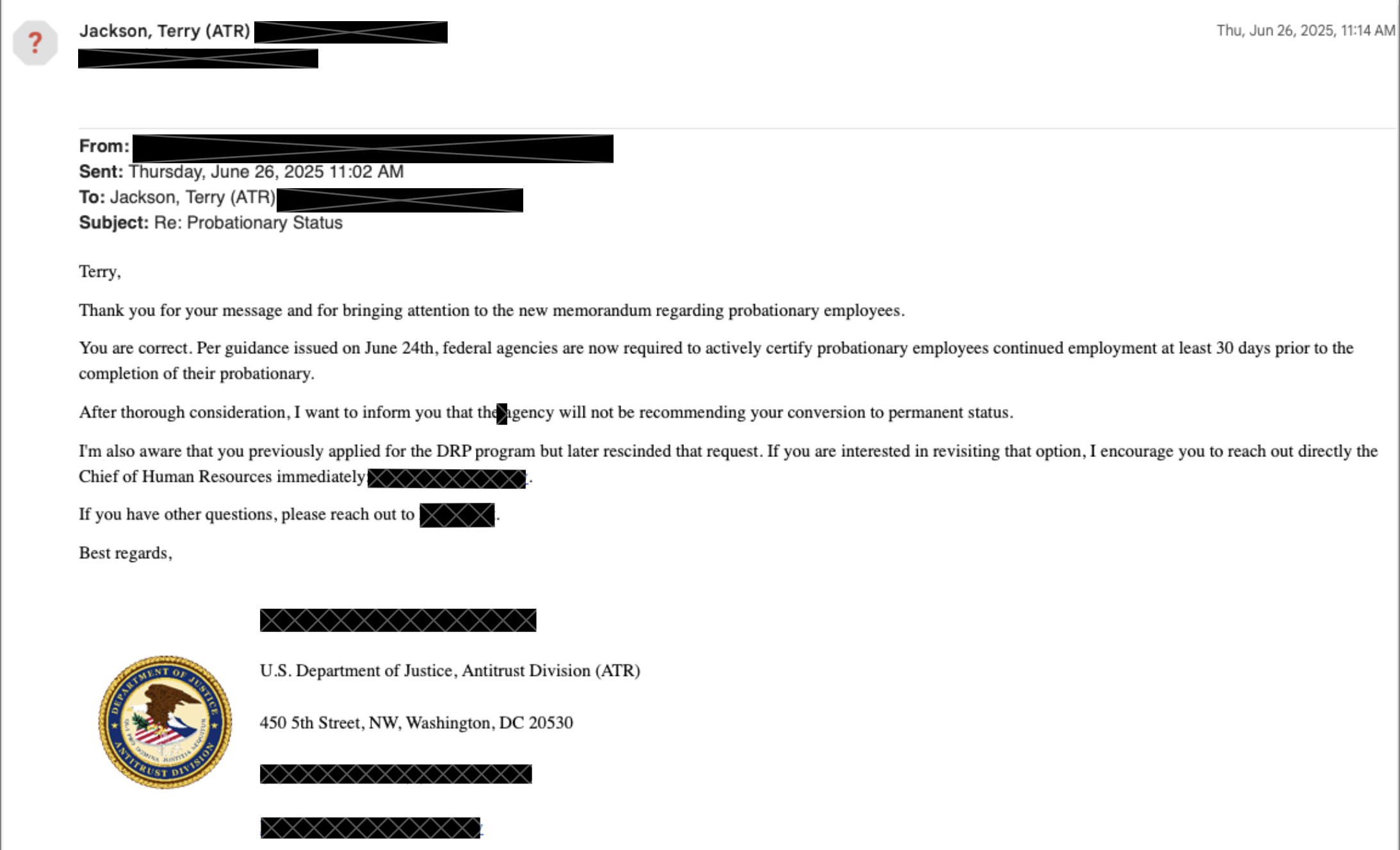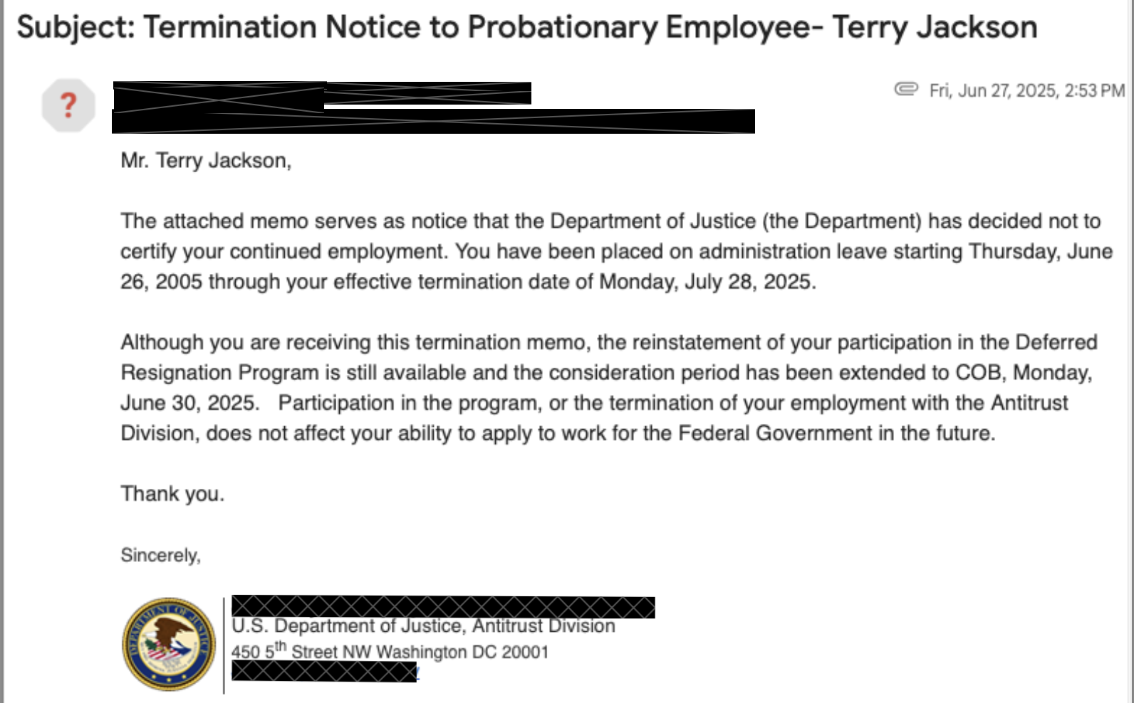 DOJ on June 27, 2025, sent him a notice that he was being put on administrative leave until the end of his probationary period, which was July 28, 2025. Due to a typo, the email said that his leave began on June 26, 2005. The notice also said that he still had the option to participate in DRP.